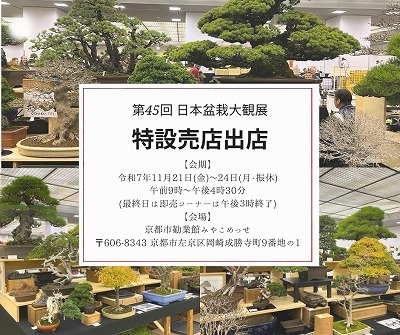 第45回日本盆栽大観展 特設売店出店のご案内 (11/21~11/24) 2025.11.02 【第45回日本盆栽大観展 特設売店出店のご案内】 今年も「日本盆栽大観展」が、無事に錦秋の古都を彩る日本文化の祭典として催される運びとなりました。 小店も同展の開催を祝し、特設売店の出店をさせていただきます。 盆栽・水石・樹鉢・水盤等々、精撰品や蔵出し品を取り揃えさせて頂きました。 小店の“今”をご堪能いただき、日頃のご厚情のご挨拶をさせていただきたく、店員一同、鶴首お待ち申し上げます。 【第45回日本盆栽大観展 BONSAI JAPAN】 会期 令和7年11月21日(金)~24日(月・振休) 午前9時~午後4時30分 (最終日は午後4時まで、即売コーナーは午後3時終了) 会場 京都市勧業館みやこめっせ 〒606-8343 京都市左京区岡崎成勝寺町9番地の1 入場料 ◆入場チケット:1,500円 ※小学生以下無料 団体割引あり ・【オプション】デモンストレーション観覧:3,000円 ・【プレミアムツアー|大宮編】ご昼食(吉草大宮 本店) + 大宮盆栽美術館 鑑賞 + 蔓青園5代目園主 加藤 崇寿さん 特別講義 + 大宮盆栽美術館 夜間特別開館ライトアップ鑑賞:19,800円 ・【プレミアムツアー|京都編】大徳寺 芳春院盆栽庭園 バスツアー + 日本盆栽大観展解説ツアー + ご昼食(京の老舗精進鉄鉢料理「あやめ」) + 入場チケット:15,000円 ・【プレミアムツアー|高松編】禅坊 靖寧 <リトリート・禅体験> + 大塚国際美術館 鑑賞 + ご宿泊(JR ホテルクレメント高松) + 高松盆栽体験(中西珍松園) + 盆栽園巡り(2か所) + ご昼食(讃岐 郷屋敷):164,000円〜168,500円 (入場料の詳細は第45回日本盆栽大観展 BONSAI JAPANホームページよりご確認ください) 京都市勧業館みやこめっせ アクセス https://bonsaijapan.jp/access/ 第45回日本盆栽大観展 BONSAI JAPANについてはこちら https://bonsaijapan.jp/