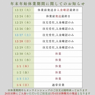 ※代引きでのご注文の場合も12月23日(火)ご注文分までを休業期間前の発送とさせていただきます。