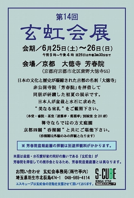 第十四回玄虹会展のお知らせ 2022.06.01 ◆第十四回玄虹会展◆ 会期/6月25日(土)~26日(日) 午前9時~午後4時 ※26日は午後3時30分まで 会場/京都 大徳寺 芳春院 (京都府京都市北区紫野大徳寺55) 日本の文化と歴史が凝縮された古都の名刹「大徳寺」 非公開寺院「芳春院」を拝借して 同朋が研鑽した初夏の展示です。 日本人が盆栽と水石に求めた “美なる室礼”をご観照下さい。 (本堂・書院・茶室「迷雲亭・落葉亭」別棟室 全20席) 禅寺ならではの方丈庭園 京都四閣“呑湖閣”と共にご堪能下さい。 (呑湖閣は外観のみの拝観となります) ※お越しいただく際のご注意※ 当展覧でお借りする大徳寺芳春院様は通常非公開の名刹となっておりますので、当展覧はご招待制とさせていただいております。ご招待券をお持ちの方、もしくは主催者の許可のある方のみご入場いただけます。予めご了承ください。 なお、本展は盆栽・水石愛好家の同好の集いである「玄虹会」が芳春院を拝借しての展示会となるため、芳春院盆栽庭園とは異なります。 ご不明点は以下までお問い合わせください。 【玄虹会事務局(雨竹亭内)】 埼玉県羽生市北荻島474-1 048-565-4114 ※エスキューブは玄虹会の活動を支援させていただいております